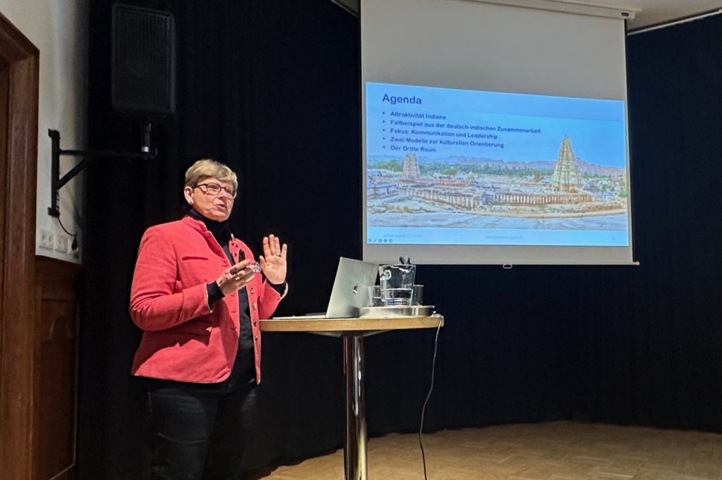 Prof. Dr. Simone Rappel zeigte auf, wie unterschiedlich Zusammenarbeit in Indien und Deutschland gestaltet wird. Während in Deutschland meist die Sachorientierung zählt, also Zahlen, Daten, Fakten, steht in Indien die Beziehungsorientierung im Mittelpunkt. Vertrauen, persönlicher Kontakt und ein respektvoller Umgang bestimmen dort die Zusammenarbeit.